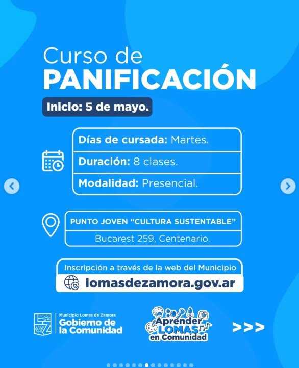 El próximo martes 7 de mayo arranca una nueva propuesta dentro del programa Aprender Lomas. Se trata de un curso de panificación dictado en el Punto Joven Cultura Sustentable , ubicado en Bucarest 259. Son ocho clases en total. El horario se va comunicar una vez que cada alumno formalice su inscripcion. Lo que sí está claro es que los encuentros van a ser los martes, y que el ritmo de trabajo va a combinar teoría con mucha práctica.