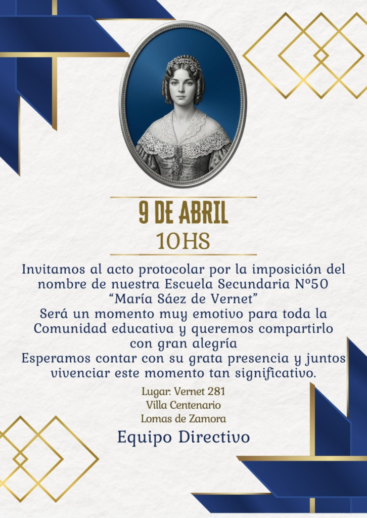 La comunidad educativa de la Escuela Secundaria 50 invita a familias, vecinos y a todo el barrio de Centenario a participar del acto de imposición del nombre “María Sáenz de Vernet”, que se llevará a cabo en el propio establecimiento ubicado en Vernet 281, Centenario. La cita es para compartir juntos un momento histórico para la institución, celebrar la identidad recién ganada y acompañar a docentes, alumnos y personal en este paso tan significativo.